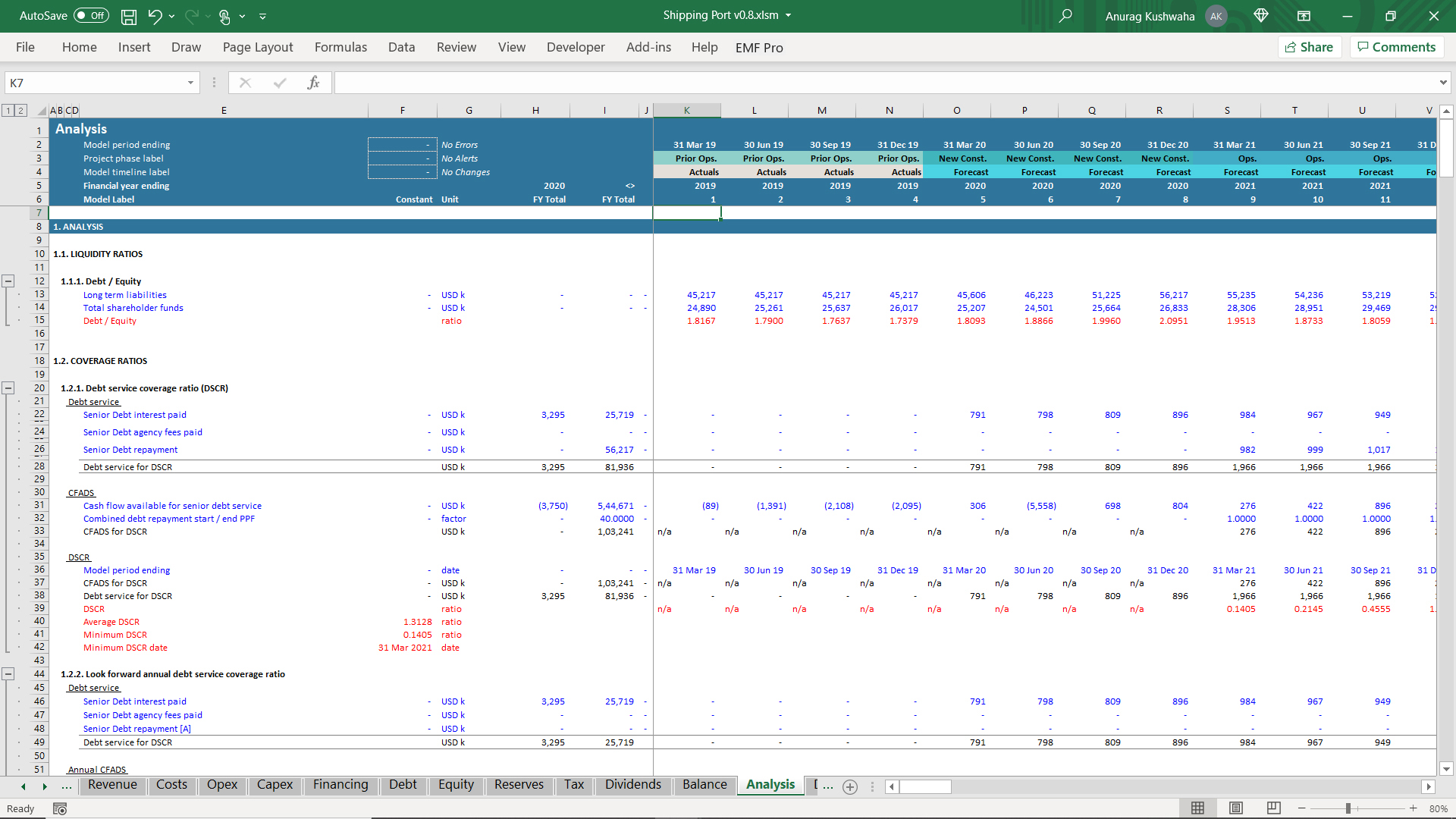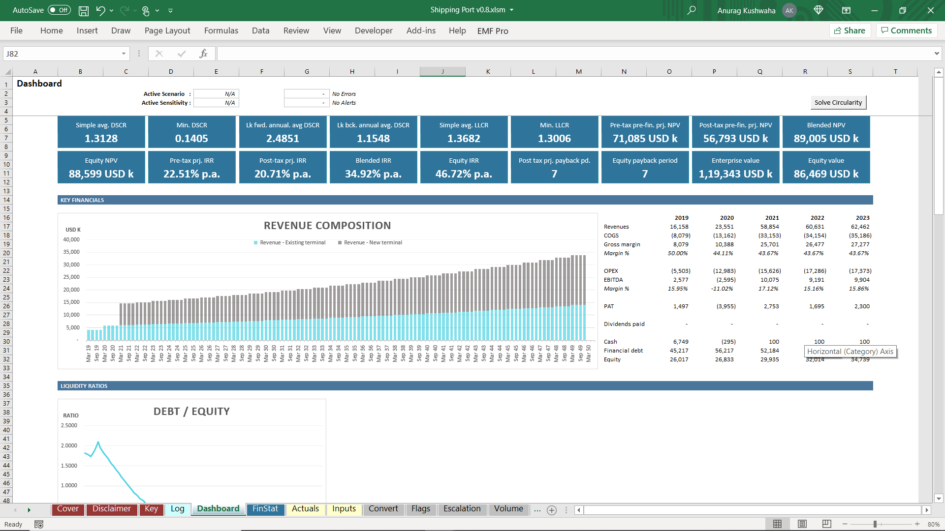 This model has been developed considering the port authority is looking to construct and open a new terminal along with an existing terminal. IRR and NPV has been calculated along with Coverage Ratios like DSCR and LLCR, considering the new terminal funding requirements.